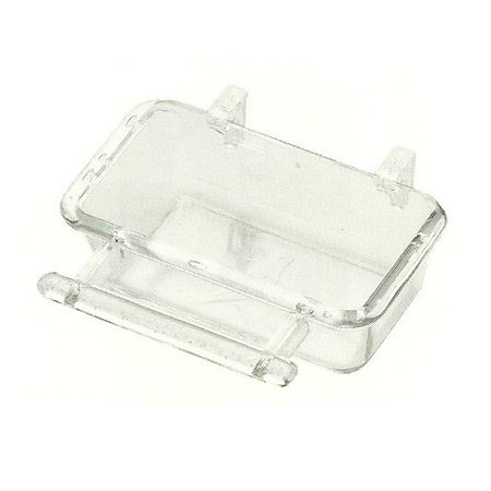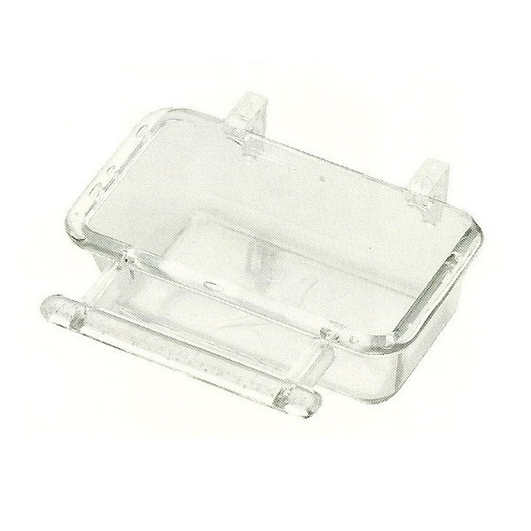 Comedero bizcochera para pájaros de plástico transparente que incluye dos ganchos para fácil colocación en los barrotes de la jaula.