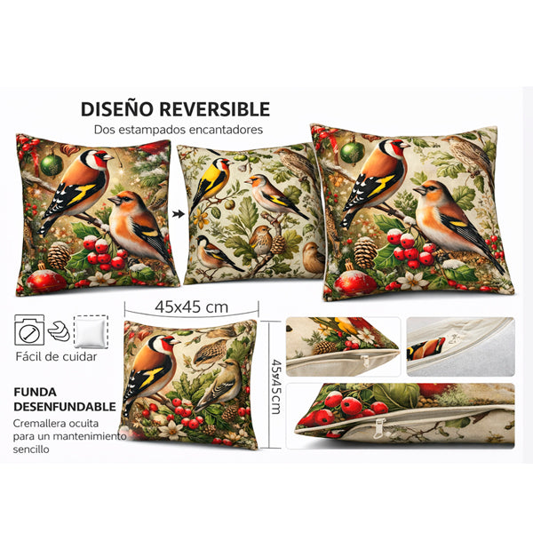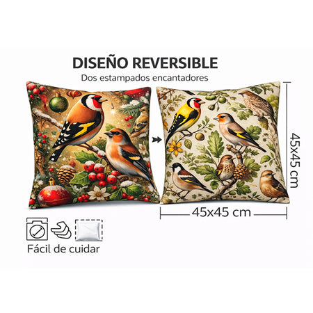 Cojín decorativo reversible 2 en 1 con ilustraciones realistas de pájaros. Ideal para sofá o cama, incluye funda desenfundable con cremallera oculta y tamaño 45x45 cm.
