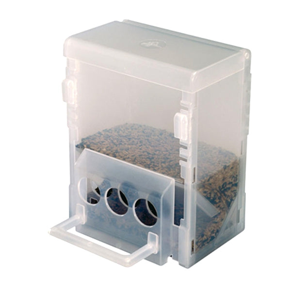 Su diseño especial impide que el pájaro tire la comida y permite que la cáscara de la semilla se deposite en una pequeña camara situada delante del depósito.