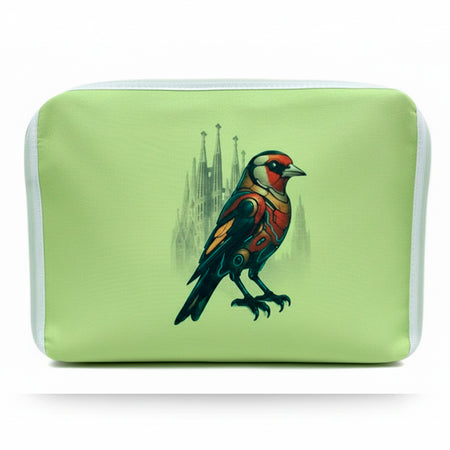 Funda para jaula C2 con diseño de jilguero cíborg frente a la Sagrada Familia. Un modelo único que combina tecnología y arte. Hecha con tela lavable y opaca para proteger del frío y la luz. Incluye cremallera y asa para fácil manejo. Ideal para jaulas medianas y amantes de los diseños originales.