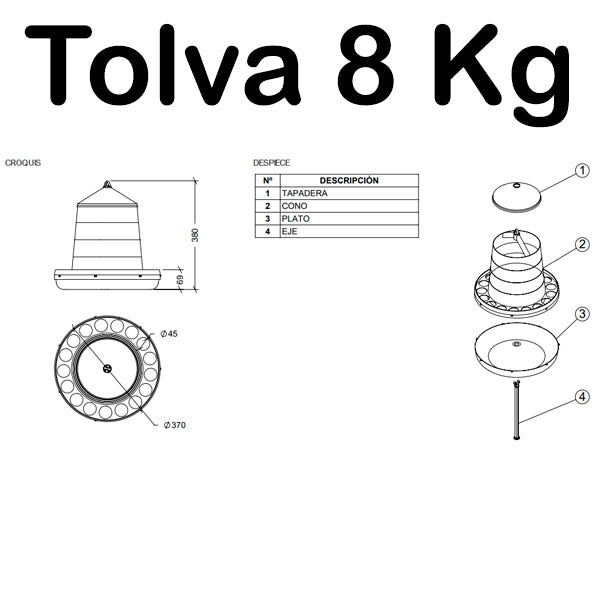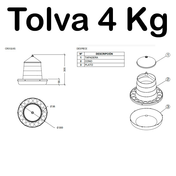 La tolva cuenta con una tapa cónica de cierre superior, que facilita el llenado y protege el alimento de la suciedad y los elementos externos. Su diseño incluye tres niveles de llenado, lo que permite ajustar la cantidad de alimento según las necesidades de tu corral. Además, la base reforzada cuenta con orificios anti-desperdicio, evitando que las aves tiren el alimento fuera del contenedor y manteniendo el área de alimentación limpia y ordenada.