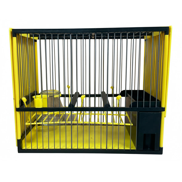 Jaula C2 negra y amarilla fabricada en acero inoxidable, resistente, cómoda y equipada con todos los accesorios necesarios para jilgueros y aves silvestres. Ideal para concurso, transporte o uso diario, con diseño moderno y fácil de limpiar.