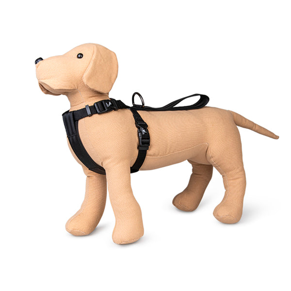 Con correa corta totalmente ajustable. Este arnés protege a su perro y a usted mismo.